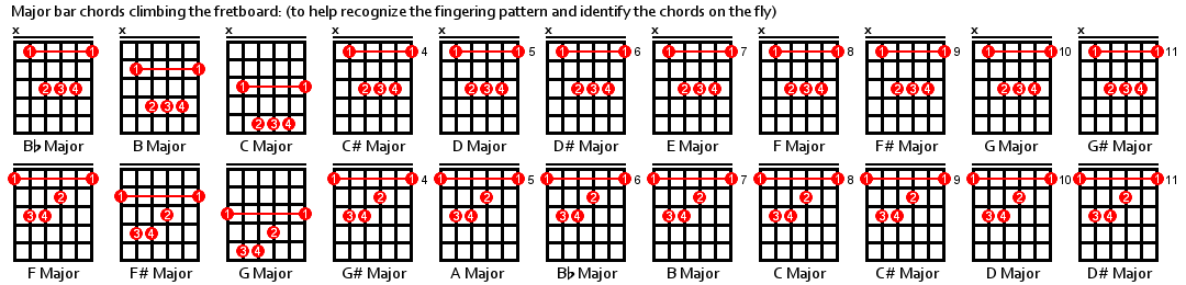 There are countless variations of chords for any instrument of the major and minor scaling system. Composers and performers alike often apply combinations of chords and/or chord sevenths creating an appoggiatura and other tone effects in their music. The tabs posted include all of the standard chords through the fourteenth fret. The chord tabs displayed in the key of scale make it easy for you to see the common chords often used from the lower the fret board. From there, you can simply transpose them to the appropriate bar or other type chords shown if needed or visa-versa. Scales too are included in these patterns. This illustration of the chords is helpful in recognizing the most commonly used chords and identifying them when sight reading or playing an instrument. For more info on interpreting string tablature, review the string tablature section in notation.